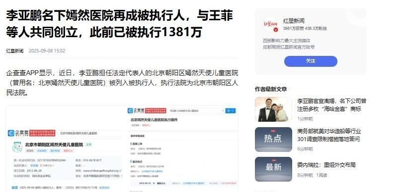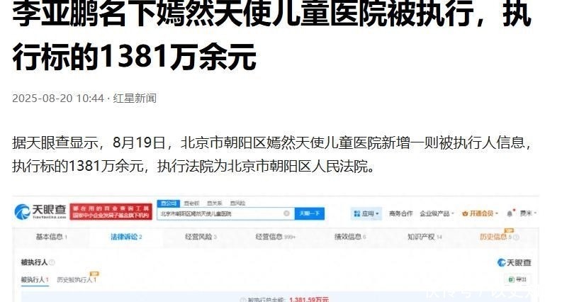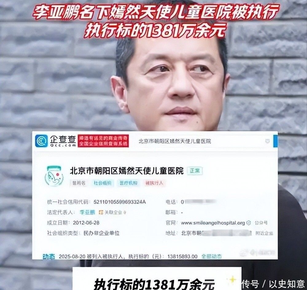 李亚鹏名下嫣然天使儿童医院被执行,执行标的1381万余元.红星新闻.2025-08-20