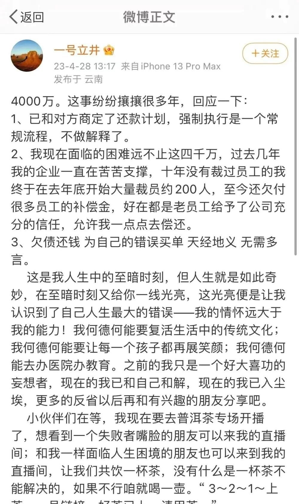 他在社交媒体写道:“人生最低谷时才明白,情怀若脱离能力支撑,只会带来灾难。”