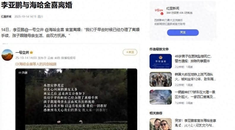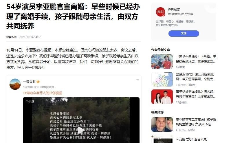 54岁演员李亚鹏官宣离婚:早些时候已经办理了离婚手续,孩子跟随母亲生活,由双方共同抚养.极目新闻.2025-10-14